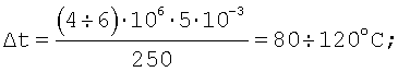 На двухвалковых установках непрерывного литья-прокатки металлов величины удельных тепловых потоков велики и достигают q=(4÷6) МВт/м2. Поэтому если бандаж изготовлен из меди и =386 Вт/м·град (см. Кац A.M., Шадек Е.Г. Теплофизические основы непрерывного литья слитков цветных металлов и сплавов. – М.: Металлургия, 1983. – 208 с.), а толщина его стенки значительно уменьшена (с обычных h=50 мм до 5 мм), то при h=5·10-3 м по формуле (1) определяем: