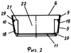 В периферийной зоне 17 внутреннего объема дополнительной емкости 5 установлены опорные вертикальные пластины 18. Каждая из пластин 18 закреплена своим боковым торцом 19 на внутренней боковой поверхности 10 дополнительной емкости 5, а нижним торцом 20 – на внутренней поверхности днища 11 емкости 5. Верхние торцы 21 пластин 18 лежат на одной плоскости, которая в зависимости от формы наружной поверхности донной части 2 корпуса 1 может быть прямолинейной или криволинейной. Преимущественно опорные пластины 18 установлены внутри дополнительной емкости 5 радиально. Внутренняя поверхность дополнительной емкости имеет ступеньку 29 с опорной поверхностью, проходящей по всему периметру внутренней поверхности и лежащей в одной горизонтальной плоскости с верхними торцами пластин. Такое выполнение поверхности 10 с внутренним перепадом по толщине обеспечивает прочное выполнение нижней части дополнительной емкости и более тонкое выполнение ее верхней части 9, что обеспечивает легкую деформацию этой части при взаимодействии ее с корпусом емкости 1 для пищевого продукта, а следовательно, их надежное скрепление при надевании одной емкости на другую.