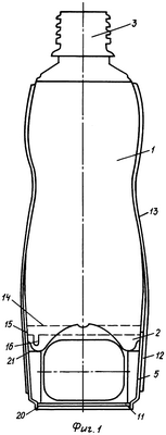 На торцы 21 пластин 18 опирается корпус 1 наружной поверхностью своей донной части. Таким образом, пластины 18 служат опорой для корпуса 1 и, кроме того, придают необходимую жесткость как дополнительной емкости 5, так и конструкции в целом. Для того чтобы положение корпуса 1 в дополнительной емкости 5 было устойчивым, количество пластин 18 должно быть не менее трех. Увеличение количества пластин 18 в разумных пределах будет способствовать повышению жесткости дополнительной емкости 5 и конструкции в целом и устойчивости корпуса 1 бутылки.