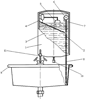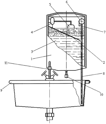 После этого открывают водоразборную арматуру 10 для отбора из емкости 1 очищенной от хлора воды, предварительно создав в пространстве над ее поверхностью атмосферное давление, например, путем включения насоса 6 в режим нагнетания воздуха или открыв в стенке емкости, сообщающейся с атмосферой отверстие (не показано). После понижения уровня воды в сосуде восстанавливают его исходный уровень и повторяют процесс деаэрации. Заметим, что если уровень воды в сосуде из-за неисправности крана 5 значительно возрастет, то вода через патрубок 7, работающий насос 6 и трубку 8 будет сливаться в раковину 9, а оттуда – в канализацию. В случае, когда для каких-нибудь целей можно использовать неочищенную от хлора воду, то ее употребляют из водоразборной арматуры 11.