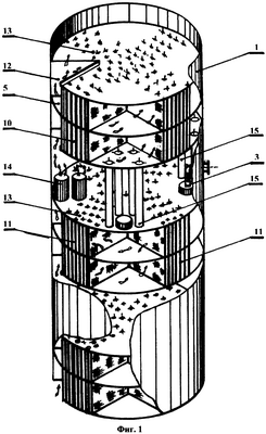 После прохождения жидкости через вышерасположенный блок регулярной перекрестноточной насадки 10 каждой контактной ступени жидкая фаза поступает по сливным патрубкам 15 на заглубленное «глухое» горизонтальное опорно-распределительное полотно 7, на котором осуществляется процесс озонолиза при инжектировании.