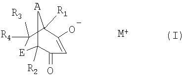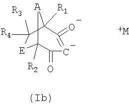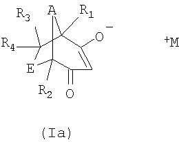 в которой R1, R2, R3, R4, А и Е имеют значения, указанные для формулы I, a б) затем превращение этого соединения в соль формулы I либо в присутствии основания и каталитически эффективного количества цианида, либо в присутствии алкоголята щелочного металла или алкоголята или гидроксида щелочно-земельного металла. В вышеприведенных определениях заместителей алкильные группы могут быть прямоцепочечными или разветвленными, примером такой группы может служить метил, этил, н-пропил, изопропил, н-бутил, втор-бутил, изобутил или трет-бутил. Алкокси представляет собой, например, метокси, этокси, пропокси, изопропокси, н-бутокси, изобутокси, втор-бутокси или трет-бутокси. Алкоксикарбонил представляет собой, например, метоксикарбонил, этоксикарбонил, пропоксикарбонил, изопропоксикарбонил, н-бутоксикарбонил, изобутоксикарбонил, втор-бутоксикарбонил или трет-бутоксикарбонил, предпочтительно метоксикарбонил или этоксикарбонил. М+ как ион щелочного металла, ион щелочно-земельного металла или аммониевый ион представляет собой, например, натриевый, калиевый, кальциевый, магниевый, триэтиламмониевый или диизопропилэтиламмониевый катион. Для улучшенной иллюстрации точек присоединения у бициклического соединения можно также представить изображения соединений формулы I следующим образом