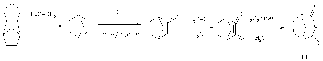 а) 98,7 г (0,81 моля) 3-метиленбицикло[2.2.1]гептан-2-она и 32,9 г (0,24 моля) тригидрата ацетата натрия в 400 мл дихлорметана используют в качестве начальной порции, загружаемой в реакционный сосуд. Далее при одновременном регулировании температуры (баня из СО2/ацетона) в пределах от -8 до -10°С с перемешиванием по каплям в течение 2,5 ч вводят 230 г 32%-ной перуксусной кислоты в уксусной кислоте (0,97 моля). После этого реакционную смесь перемешивают при температуре -8°С в течение дополнительного часа. Затем добавляют 200 г льда, а потом 20 г (0,16 моля) сульфита натрия в 100 мл воды. Органическую фазу отделяют и промывают водой, сушат над сульфатом магния и концентрируют с получением в виде жидкого остатка 81,9 г 4-метилен-3-оксабицикло[3.2.1]октан-2-она с его содержанием 93% и выходом продукта 68,2%. 1H-ЯМР (CDCl3): 4,42 част./млн, d, 1Н; 4,18 част./млн, d, 1H; 3,08 част./млн, 2Н; 1,95-2,08 част./млн, 4Н; 1,84 част./млн, m, 1H; 1,67 част./млн, m, 1H. б) В реакционном сосуде 95,2 г 3-метиленбицикло[2.2.1]гептан-2-она растворяют в 400 мл метиленхлорида, добавляют 32,6 г тригидрата ацетата натрия и смесь охлаждают до температуры -10°С. Далее с перемешиванием при температуре от -8 до -10°С в течение 2,40 ч вводят 199 мл 36-40%-ной перуксусной кислоты и реакционную смесь перемешивают в течение последующих 2 ч при -10°С. В дальнейшем реакционную смесь добавляют в 400 г смеси воды со льдом и органическую фазу отделяют и обрабатывают смесью 100 г льда со 100 мл 15%-ного раствора сульфита натрия. Затем органическую фазу промывают 100 мл 25%-ного раствора карбоната натрия, после чего 100 мл воды. Объединенные водные фазы промывают 200 мл метиленхлорида. Далее объединенные органические фазы с помощью роторного испарителя концентрируют при температуре бани 50°С. Оставшуюся жидкость подвергают фракционной перегонке в колонке под остаточным давлением 53 Па с получением при температуре от 40 до 45°С 27 г 3-метиленбицикло[2.2.1]гептан-2-она (исходный материал) и при температуре от 55 до 60°С 60 г 4-метилен-3-оксабицикло[3.2.1]октан-2-она, что соответствует выходу продукта 55,7% в пересчете на исходный материал и селективности 77,8% (в пересчете на прореагировавший материал). Пример 2: получение 4-метилен-3-оксабицикло[3.2.2]нонан-2-она из 3-метиленбицикло[2.2.2]октан-2-она (соединение № 1.070)