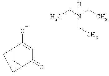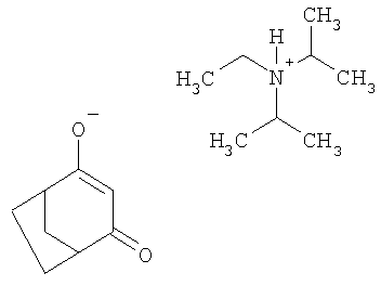 2,76 г (20 ммолей) 4-метилен-3-оксабицикло[3.2.1]октан-2-она при температуре 55°С выдерживают в течение 2,5 ч в присутствии 2,23 г (20 ммолей) триэтиламина и 0,13 г (2 ммоля) цианида калия. Мутную реакционную смесь фильтруют через вспомогательное вещество для фильтрования HyfloR и выпаривают досуха. В виде смолистого гигроскопического продукта получают триэтиламмониевую соль 4-гидроксибицикло[3.2.1]окт-3-ен-2-она. Пример 4: получение этилдиизопропиламмониевой соли 4-гидроксибицикло[3.2.1]окт-3-ен-2-она из 4-метилен-3-оксабицикло [3.2.1 ]октан-2-она