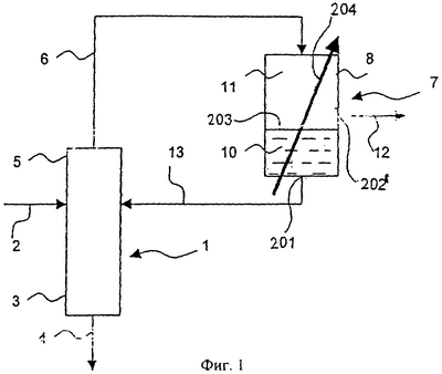 – трубопровод 13, который позволяет подавать рециклом конденсат в дистилляционную колонну 1.