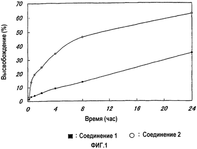 Фиг.1 представляет собой графическое изображение высвобождаемого количества лекарственных средств в отсутствии гидролитического фермента, выраженное в процентах по отношению к суммарному количеству лекарственного средства в примере 3. По абсциссе отложено время, а по ординате – высвобождаемое количество.