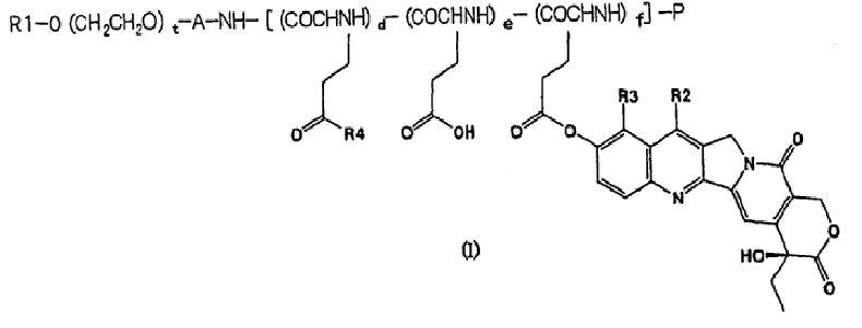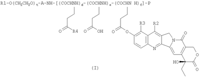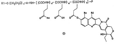 (9) Высокомолекулярное производное камптотецинов, полученное взаимодействием блок-сополимера полиэтиленгликольной составляющей и полиаминоглутаминовой кислоты или полиаспарагиновой кислоты с фенольным камптотецином в органическом растворителе с использованием конденсирующего средства.