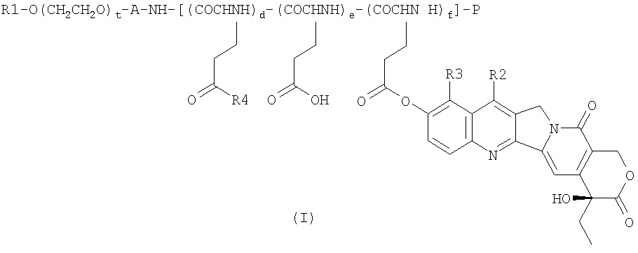 Кроме того, в качестве высокомолекулярных производных камптотецинов, связанных с блок-сополимером полиэтиленгликоля и полимера кислой аминокислоты посредством фенольных камптотецинов, по настоящему изобретению включены, например, соединения вышеуказанной общей формулы (I) [где, R1 означает атом водорода или (С1-С6)-алкильную группу, необязательно содержащую заместитель, t означает целое число от 5 до 11500, А означает связывающую группу, d+e+f равно целому числу от 3 до 200, R2 означает атом водорода или (С1-С6)-алкильную группу, необязательно содержащую заместитель, или силильную группу, необязательно содержащую заместитель, R3 означает атом водорода или (С1-С6)-алкильную группу, необязательно содержащую заместитель, R4 может быть одинаковым или различным и означает (С1-С20)-алкоксильную группу, необязательно содержащую заместитель, (С1-С20)-алкиламиногруппу, необязательно содержащую заместитель, ди-(C1-C20)-алкиламиногруппу, необязательно содержащую заместитель, или (C1-C20)-алкиламинокарбонил-(C1-C20)-алкиламиногруппу, необязательно содержащую заместитель, и P означает атом водорода, (C1-C6)-ацильную группу или (C1-C6)-алкоксикарбонильную группу].