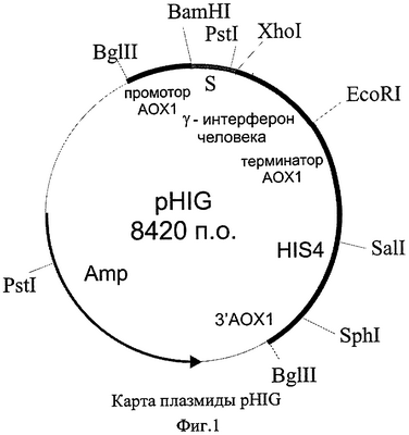 Плазмида pHIG получена на основе челночного бактериально-дрожжевого интегративного вектора рPIC9 (имеется в продаже (“Invitrogen”)). В результате трансформации линеаризованной плазмидой и последующей гомологичной рекомбинации происходит встраивание экспрессионной кассеты в хромосому дрожжей Pichia pastoris, что обеспечивает стабильное поддержание клонированного гена гамма-интерферона. Преимуществом такой интегративной системы экспрессии является также отсутствие в геноме дрожжей интегрантов фрагментов бактериальной ДНК и генов устойчивости к антибиотикам, что предотвращает опасность горизонтального переноса этих генов. В состав плазмиды входит ген HIS4 дрожжей, что позволяет селективно отбирать трансформантов при использовании в качестве реципиентов штаммов дрожжей с мутациями в этом гене, а также препрообласть гена MF дрожжей Saccharomyces cerevisiae, обеспечивающая секрецию рекомбинантного белка в культуральную среду.