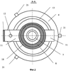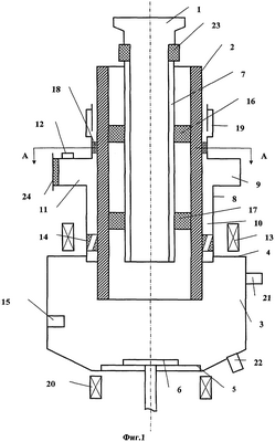 Нижний конец внутренней трубы 7 заглублен относительно нижнего торца катода 2, а верхний ее конец через изолятор 22 подключен к питателю 1. Анод 6 печи совмещен с устройством сбора 5, внутренняя труба 7 является дополнительным (вторым) анодом. Внешняя труба 8 закреплена на крышке 4 рабочей камеры 3 и вместе с катодом 2 образует коаксиальную линию, верхним концом подключенную к коаксиально-волноводному переходу 9. Ось волновода 11 и его широкая стенка перпендикулярны оси устройства, патрубок ввода 12 восстановительного газа размещен в одной из стенок волновода 11. Соленоид 13 окружает охлаждаемую внешнюю трубу 8 над рабочей камерой 3. На этом же участке в зазоре между полым электродом 2 и внешней трубой 8 установлен диэлектрический завихритель газового потока 14, одновременно выполняющий роль фиксатора этого зазора. Те же роли фиксаторов зазоров выполняют изоляторы: 16 – в верхней части, 17 – в нижней части зазора между катодом 2 и трубой 7, 18 – между электродом 2 и дросселем 19. Дроссель 19 предотвращает СВЧ-излучение в окружающее пространство и может иметь конструкцию, не обязательно такую, которая представлена здесь. Например, в зазор между катодом 2 и продолжением внешней трубы над волноводом 11 может быть помещен диэлектрический поглощающий СВЧ-энергию материал.