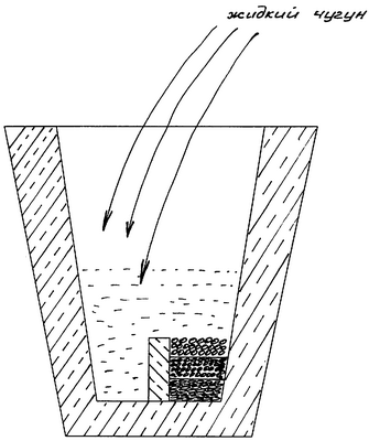 Способ производства чугуна в вермикулярным графитом основан на применении комплексного быстроохлажденного («чипс») модификатора вермикуляризирующего действия совместно с графитизирующим модификатором и рафинирующим материалом. Предлагается метод модифицирования в ковше. Ковши могут использоваться емкостью от 50 кг до 30 тонн. Схема способа получения чугуна с вермикулярным графитом представлена на чертеже. Очередность введения материалов в ковш: вермикуляризирующий комплексный модификатор, графитизирующий модификатор, рафинирующий материал. При наполнении ковша жидким чугуном, вначале взаимодействие происходит с верхним слоем введенных добавок. В качестве рафинирующего материала используют лигатуры на железо-кремниевой основе, содержащие редкоземельные материалы (типа ФСЗ0РЗМ30, ФСЗ0РЗМ20 и т.д.) фракцией 0,5-20 мм в количестве 0,2-0,8% от массы металла. В результате взаимодействия их с металлом в объеме расплава образуются комплексы оксидов редкоземельных металлов, которые осаждаются на подложках растущей графитной фазы. Ввод рафинирующего материала ниже нижнего уровня (менее 0,2%) не обеспечивает образования достаточного количества оксидов редкоземельных металлов, которые являются инициаторами формирования вермикулярного графита. Ввод рафинирующего материала выше верхнего уровня (более 0,8%) создает повышенное переохлаждение расплава, что приводит к образованию сложных карбидов.