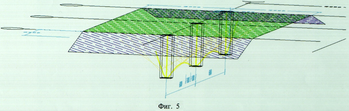 Укладка наклонных тяг конструкции фундамента 2 осуществляется в предварительно прорезанные траншеи шириной 150 мм, которыми изрезается площадка вдоль и поперек с шагом, например, 1000 мм или наиболее приемлемым, удобным 1500 мм. Вертикальный профиль траншей, как показывает практика, сохраняется на период подготовительных работ, размещения всех элементов фундамента и последующего бетонирования.