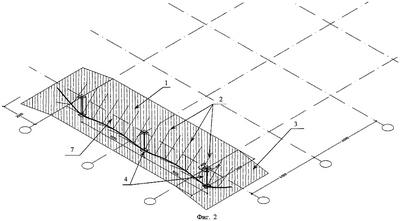 На фиг.3 – принципиальная схема ферменно-ленточного фундамента под зданием, сооружением (плоскостной вариант), помимо уже означенных выше элементов 1, 2, 3, 4, 7, схематично отображает само здание – 8, ради которого и возводится фундамент, 6 – вантовый элемент фундамента; 9 – возможное положение уровня грунта относительно заглубленной отмостки. На фиг.4 – схема ферменно-ленточного фундамента под зданием, сооружением (пространственный вариант).