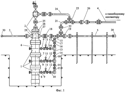 На верхнем 6, среднем 7 и нижнем 8 межколонных пространствах колонной головки 1 установлены задвижки 9, к которым присоединены соответственно верхний, средний и нижний отводы 10 с размещенными на них устройствами для замера давлений 11, например, манометрами для визуального замера давлений или электроконтактными устройствами для дистанционного замера давлений, и отсекающими задвижками 12. Отводы 10 соединены между собой перемычками 13 с размещенными на них отсекающими задвижками 14. Верхняя перемычка 13 соединена с факельной линией 5 посредством патрубка 15. Патрубок 15 снабжен отсекающей задвижкой 16 и предохранительным клапаном 17, размещенным за отсекающей задвижкой 16. Место соединения патрубка 15 с факельной линией 5 с обеих сторон снабжено отсекающими задвижками 18 и 19. На конце факельной линии 5 размещено факельное устройство 20, например горелка, для сжигания выпускаемого из скважины газа, чтобы снизить загрязнение окружающей природной среды. Факельная линия 5 посредством байпаса 21 с размещенной на нем отсекающей задвижкой 22 и тройником 23 соединена с рабочей струной 24 елки 25 фонтанной арматуры 2 и выкидной линией 4 с размещенной на ней отсекающей задвижкой 26. Одновременно факельная линия 5 присоединена к задвижке 27, размещенной с одной стороны трубной головки 28 фонтанной арматуры 2. К задвижке 29, размещенной с другой стороны трубной головки 28, присоединена задавочная линия 3 с размещенным на конце быстроразъемным или фланцевым соединением 30.