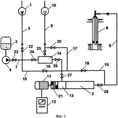 Затем, когда порция газа уйдет в пласт и в стволе скважины, а также в призабойной зоне будет находиться вода, давление закачки снизится. После этого отключается дожимной насос 2, а задвижки 19, 27 и 28 закрываются. Открываются задвижки 18, 23, 24. 25 и 26. Запускается дозировочный насос 4, который подает пенообразующие ПАВ из емкости 3 по линии 7 в линию подачи воды 5. Поток воды с ПАВ по линии 5 и поток газа по линии 6 поступают в смеситель 14, из которого пузырьковая водогазовая смесь по первой перепускной линии 15 и линии 8 идет в скважину 9.