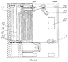 Для котлов, где сжигается топливо с большим выходом летучих веществ и возможно отложение сажи на поверхностях горизонтально расположенных труб, предусмотрено исполнение с вертикальным расположением труб в боковых экранах-перегородках и секциях конвективных пакетов (фиг.4, 5, 6). При таком исполнении боковые экраны-перегородки 16 и боковые секции 17 конвективных пакетов соединены с промежуточными секциями 18 и 19 перпендикулярными трубными переходами 20 в пределах котла и выполнены в виде спаренных секций. Входные и выходные патрубки секций конвективных пакетов и экранов соединяются трубными переходами на фланцах 21, 22, 23 вне котла на его передней стенке.
