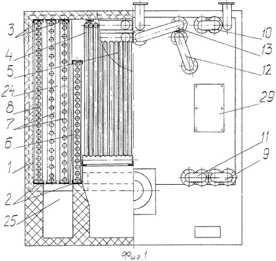 При сгорании топлива в топке котла дымовые газы через фестоны, образованные боковыми экранами-перегородками, попадают в конвективные газоходы 24, затем через отводящие газоходы 25 с задней стороны котла попадают в общий газоход.