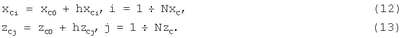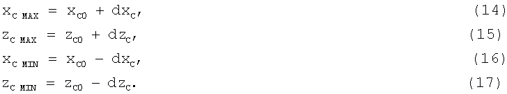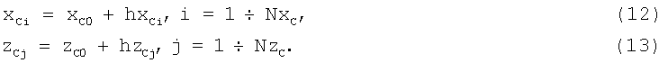 По рассчитанным координатам xC0 и ZC0 центров каждой ОЦ в системе XOZ и параметрам рубежей обстрела рассчитывают координаты xCi и zCj ТП для обстрела каждой ОЦ по формулам: