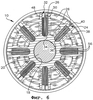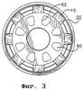 Основа 16 обладает симметрией восьмого порядка, а различные части основы и связанных компонентов определены ссылочными позициями, где они представлены с наибольшей ясностью на прилагаемых чертежах. Не все одинаковые компоненты обозначены ссылочными позициями, чтобы избежать перенасыщения чертежей ссылочными позициями. Основа 16 (фиг.5 и 6) включает восемь прорезей 32 для стабилизаторов, при этом каждая из них имеет закрытое основание 34 (фиг.6), проходящее параллельно оси сопла. Стабилизаторы 24, прорези 32, в которых они удерживаются, и их установки – все подобны друг другу, и только один описан подробно.