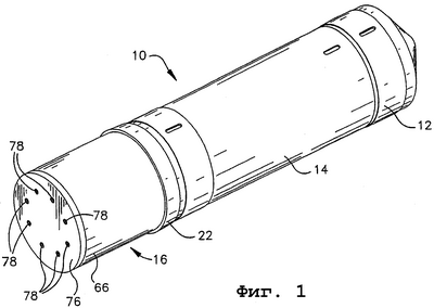 Снаряд 10, показанный на фиг.1, представляет собой снаряд, который может получить преимущество от использования настоящего изобретения. Снаряд 10 является подходящим для использования, например, в орудии с калибром 155 мм. Снаряд 10 имеет носовую часть 12, которая может нести устройства наведения, так же, как и полезный груз, подлежащий доставке. Корпус 14 снаряда 10 может включать топливо, которое сгорает для доставки снаряда к намеченной цели. При загрузки в орудие основа 16 снаряда 10 включает в себя сужающееся в направлении наружу сопло 18 (фиг.2) и воспламенитель 20, расположенный в сопле. Когда воспламенитель 20 активизируют после вылета из ствола орудия, он вспыхивает для поджига топлива в корпусе, которое затем сгорает, заставляя выхлопные газы через сопло 18 продвигать снаряд 10. Хотя показано и описано на примере снаряда 10, имеющего сопло 18 и, следовательно, ракетный двигатель, очевидно, что настоящее изобретение одинаково применимо и к снарядам, которые не имеют сопла 18 или ракетного двигателя.