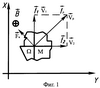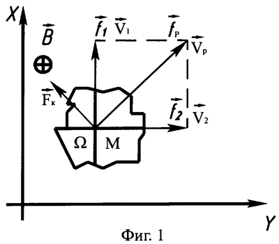 На фиг.1 схематично показана реализация способа. К некоторой массе М одновременно в направлении осей Х и Y прикладываются знакопеременные силы с амплитудами f1 (сила возбуждение первой рабочей моды) и f2 (сила возбуждения второй рабочей моды). По правилу сложения векторов результирующая знакопеременная сила направлена по диагонали. При действии угловой скорости на колеблющуюся со знакопеременной скоростью Vp массу М возникающая сила Кориолиса Fk стремится изменить направление Vp: