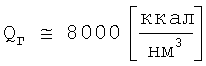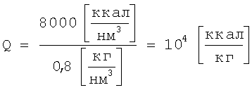 Калорийность газа [Справочник машиностроителя. В трех томах. Том 1. Ред. акад. Е.А. Чудаков. М., ГИНТИ «Машиностроение», 1951 г., 1036 с.]. Здесь 1 [нм3] – это так называемый нормальный кубометр (т.е. при 1 атм и нормальной температуре). Вес 1 [нм] равен 0,8 кг. Отсюда