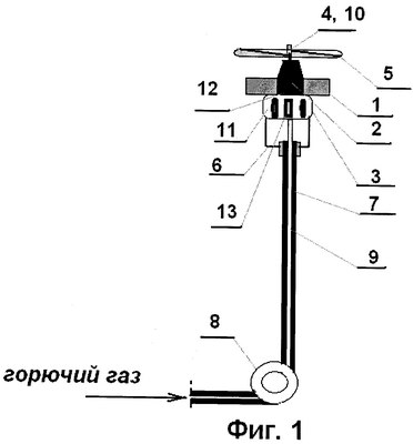 Подъемная сила создается воздушным тяговым винтом 5, вращение которого обеспечивается преобразователями энергии газообразного рабочего тела в полом канале 9. Для создания горизонтальной составляющей тяги винта электродвигатель, установленный в кардановый подвес, наклоняется в нужном направлении при помощи системы управления и стабилизации (не показана).