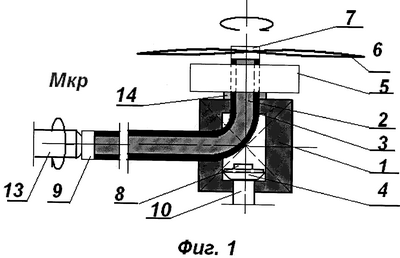 В процессе подъема (фиг.1) крутящий момент передается по цепи от вала 13 двигателя (источника крутящего момента) на винт 6 через элементы зацепления выходного вала и полумуфты 9, жесткую связь полумуфты и первого конца гибкого торсиона 2, торсион, жесткую связь второго (верхнего) конца гибкого торсиона с цапфой винта 6. Подъемная сила создается воздушным тяговым винтом 6 и под ее действием винтокрылая платформа с летательным аппаратом и станция приема и передачи сигналов поднимаются на заданную высоту навигации. При этом гибкий торсион с оболочкой протягиваются подъемной силой через горизонтальное и вертикальное отверстия корпуса, а источник крутящего момента находится в постоянном контакте с торсионом. При достижении платформой заданной высоты выходной вал источника крутящего момента и полумуфта размыкаются, а замыкатель перемещается вертикально вверх, входит в зацепление в вертикальном направлении с полумуфтой, повернувшейся на 90° в вертикальной плоскости под действием подъемной силы, и в горизонтальном направлении – с валом двигателя (источника крутящего момента) посредством элементов 11 и 12 передачи крутящего момента во взаимно перпендикулярных направлениях (конической зубчатой передачи). В процессе навигации (фиг.2) платформы необходимый винту летательного аппарата крутящий момент передается по цепи от вала 13 двигателя (источника крутящего момента) на винт 6 через элементы 11 и 12 конической зубчатой передачи, шлицевые торцевые элементы замыкателя 4 и полумуфты 9, жесткую связь полумуфты и первого конца гибкого торсиона 2, торсион, жесткую связь второго (верхнего) конца гибкого торсиона с цапфой винта 6.