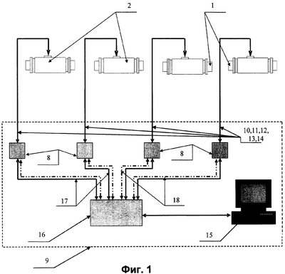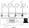 – на фиг.1 показано устройство для измерения параметров проточных многокомпонентных сред, общая схема для четырех трубопроводов;