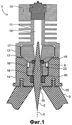 Для улучшения механической и/или электромагнитной связи волнового согласующего элемента 2 в волноводе 1 или его переднем концевом участке 12-14 на волноводе 1 в области его центрального участка 20 размещено контактное кольцо 40. Это контактное кольцо 40 простым способом может припаиваться к металлизации 23. Согласно особенно предпочтительной форме выполнения другое контактное кольцо 41 закреплено соответствующим образом на волновом согласующем элементе в области заднего конца металлизации 23. Переднее из контактных колец 40 служит в качестве опоры для переднего из концевых участков 14 волновода 1. Заднее контактное кольцо 41 служит как задняя опора для зажатия волнового согласующего элемента 2 по отношению к задней накладке, которая выполнена в волноводе 1, причем задняя накладка выполнена одним из показанных компонентов 17. Контактные кольца 40, 41 могут также отсутствовать.