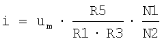Пять сопротивлений w1, w2, w3, w4, w5 имеют соответствующие величины сопротивления R1, R2, R3, R4, R5. Величина сопротивления R1 выбирается равной величине сопротивления R2, а величина сопротивления R4 выбирается равной величине сопротивления R5. Текущий в систему 16 возбуждения переменный ток i вычисляется по следующей формуле, где выходное напряжение умножителя m обозначено как um: