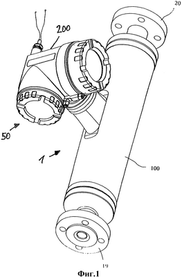 На фиг.1 показано устройство 1 для измерения вязкости с предпочтительно расположенным в корпусе 100 преобразователя измерительным датчиком 10 вибрационного типа, а также с корпусом 200 для электронной схемы, в котором расположена соединенная электрически с измерительным датчиком 10 электронная схема 50 измерительного устройства; ее описание будет приведено ниже.