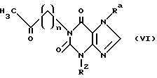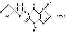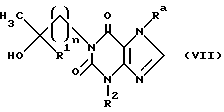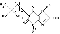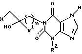 1,3,7-тризамещенные ксантины формул IV, VII и X, содержащие в качестве Ra алкоксиметильную группу, представляют собой 0,N-ацетали и вследствие этого легко расщепляются в обычных условиях кислого гидролиза. Предпочтительными остатками являются, например, метоксигруппа, этоксигруппа, пропоксигруппа и бутоксиметильная группа. Реакция преимущественно проводится при нагревании в разбавленных минеральных кислотах, таких как соляная или серная кислота, в случае необходимости с добавлением ледяной уксусной кислоты, диоксана, тетрагидрофурана или низшего спирта в качестве агента растворения. Иногда используют также перхлорную кислоту или органические кислоты, такие как трихлоруксусная, муравьиная и уксусная кислоты, в сочетании с каталитическими количествами минеральных кислот. Расщепление эфирной группы может быть в принципе проведено также с помощью кислот Льюиса, таких как бромистый цинк и тетрахлористый титан, в безводной среде, предпочтительно в дихлорметане или хлороформе. При расщеплении в растворе минеральной кислоты температура реакции должна быть выбрана так, чтобы не происходило никакой заметной дегидратации находящейся в положении 1 третичной гидроксиалкильной группы; поэтому она не должна, как правило, превышать 60oC.