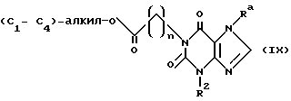Изобретение относится к новым азотсодержащим гетероциклическим соединениям, обладающим биологической активностью, более конкретно к производным ксантина, их стереоизомерам и физиологически переносимым солям, а также к фармацевтической композиции, обладающей уменьшающей паталогическую гиперактивность эозинофильных гранулятов активностью. Известны производные триалкилксантина, обладающие биологической активностью, например, уменьшающей паталогическую гиперактивность эозинофильных гранулятов активностью (см. заявку ЕР N 0544391, A1, А 61 К 31/52, 02.06.1993). Задачей изобретения является расширение ассортимента производных ксантина, обладающих биологической активностью, в частности уменьшающей патологическую гиперактивность эозинофильных гранулоцитов активностью. Поставленная задача решается предлагаемыми производными ксантина общей формулы (I) ![]() где R1 – метил или этил, R2 – алкил с 1-4 атомами углерода, X – атом водорода или гидроксил, n – целое число от 1 до 5, причем при R1 – метил, R2 – метил, X – атом водорода, n означает число 1, 2, 3, 5, их стереоизомерами и физиологически переносимыми солями. В первую группу предпочтительных производных ксантина общей формулы (I) входят соединения, у которых R2 означает метил или этил. Во вторую группу предпочтительных производных ксантина общей формулы (I) входят соединения, у которых Х означает атом водорода. В третью группу предпочтительных производных ксантина общей формулы (I) входят соединения, у которых R1 – метил, R2 – метил или этил, X – атом водорода, n – целое число от 1 до 5. Новые производные ксантина общей формулы (I) можно получать известными способами. Преимущественно поступают таким образом, что 3,7-дизамещенное производное ксантина формулы (II), ![]() в которой R2 означает алкильную группу, содержащую oт одного до четырех атомов углерода, a Ra означает легкоудаляемую группу, например гидролитически отщепляемый метильный, этильный, пропильный или бутоксиметильный остаток или удаляемую восстановлением бензильную или дифенилметильную группу с незамещенными или замещенными фенильными кольцами, целесообразно в присутствии основного агента конденсации или его соли подвергают взаимодействию а) с алкилирующим средством формулы (III) ![]() в которой R1, X и n имеют вышеназванные значения, a Z означает галоген, предпочтительно хлор, бром или иод, либо группировку эфира сульфоновой кислоты или эфира фосфорной кислоты, до получения 1,3,7-тризамещенного ксантина формулы IV ![]() причем R1, R2, Ra, X и n имеют вышеопределенные значения или альтернативно для случая, когда Х означает водород, б) с кето – соединением формулы V, H3C – СО – (СН2)n – Z (V) в которой n и Z имеют вышеназванные значения, до получения 1,3,7 – тризамещенного ксантина формулы VI ![]() который затем с помощью метил-/ или этилметаллосоединения (R1 – М), предпочтительно в виде метил- или этиллития (R1-Li) или соответствующих соединений Гриньяра (R1-MgHal) в условиях восстановительного алкилирования карбонильной группы переводят в 1,3,7-тризамещенный ксантин формулы VII ![]() в которой R1, R2 и n имеют вышеназванные значения, или альтернативно для случая, когда X означает водород, a R1 означает метил, в) со сложным эфиром карбоновой кислоты формулы VIII (C1-C4)алкил-O-CO-(CH2)n, -Z (VIII) в которой n и Z имеют вышеназванные значения, до получения 1,3,7-тризамещенного ксантина формул IX ![]() в которой Ra, R