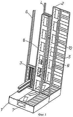 Средние каркасные панели 2 и 8 прикреплены вдоль центральной линии конструкции 1 основания. В модульной каркасной конструкции, сооруженной в виде ряда ячеек, одна средняя каркасная панель 2 установлена на концы, а пара 8 каркасных панелей установлена в точки продольного соединения, иными словами, между модулями конструкции основания. Угловой 4, передний 5 и задний 6 профили представляют собой длинные профильные рейки или соответственно подгоняются к конструкции основания. Угловые профили 4 находятся в углах конструкции основания, передние профили 5 находятся в передней части каркасной конструкции, а задние профили 6 установлены в заднюю часть каркасной конструкции. Защитное ограждение, состоящее из панелей и дверец (не показанное на чертежах), которое ограждает конструкцию, установлено в упомянутые профили способом, который уже известен.