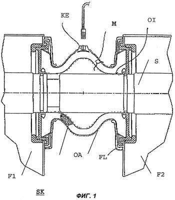 На фиг.2 муфта М показана в другом разрезе, где встроенный в нее электрод связи КЕ виден еще лучше.
