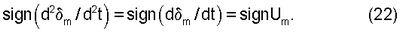 Момент возникновения АР фиксируют по изменению знака второй производной от угла m по времени в сторону совпадения со знаками его первой производной и моделируемого напряжения Um:
