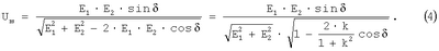 С учетом известных ограничений (0,81(2)=(0,9÷1,1)·Uн, где Uн – номинальное напряжение [1, с.19]) в предположении, что 2·k/(1+k2)=1, формула (4) приводится к виду (3) с погрешностью не более 1,5% в диапазоне =(60÷300)°, причем эта погрешность на превысит (5÷10)%, если принять Ua=Uн.