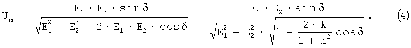 В этом нетрудно убедиться, если найти Um как высоту треугольника, образованного векторами E1, Е2 и Е, совпадающую с вектором UTMH (фиг.2):