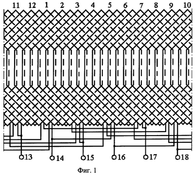 Согласно фиг.1 и 6 двухслойная статорная обмотка двухполюсной асинхронной машины состоит из 12 катушечных групп с выводами 13, 14, 15, 16, 17, 18 от объединенных начала 4 и конца 3 катушечных групп, от объединенных начала 8 и конца 7 катушечных групп, от объединенных начала 12 и конца 11 катушечных групп, от объединенных начала 2 и конца 5 катушечных групп, от объединенных начала 6 и конца 9 катушечных групп, от объединенных начала 10 и конца 1 катушечных групп, при этом начало 1 катушечной группы соединено с началом 7 катушечной группы, начало 5 – с началом 11, начало 9 – с началом 3 катушечной группы.