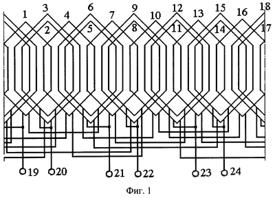 Согласно фиг.1 и 2 однослойная статорная обмотка четырехполюсной асинхронной машины состоит из 18 катушечных групп с выводами 19, 20, 21, 22, 23, 24 от объединенных начала 1 и начала 18 катушечных групп, от объединенных начала 14 и конца 15 катушечных групп, от объединенных начала 2 и конца 3 катушечных групп, от объединенных начала 8 и конца 9 катушечных групп, от объединенных начала 12 и начала 13 катушечных групп, от объединенных начала 6 и начала 7 катушечных групп, при этом конец 1 катушечной группы соединен с концом 5 катушечной группы, начало 5 с началом 10, конец 10 с концом 14, начало 14 с концом 15, начало 15 с концом 6, начало 6 с началом 7, конец 7 с концом 11, начало 11 с началом 16, конец 16 с концом 2, начало 2 с концом 3, начало 3 с концом 12, начало 12 с началом 13, конец 13 с концом 17, начало 17 с началом 4, конец 4 с концом 8, начало 8 с концом 9, начало 9 с концом 18, начало 18 с началом 1, а конденсаторы возбуждения С соединены с выводами 20, 22, 24. МДС обмотки не содержат четных гармоник.