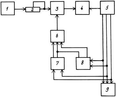 На чертеже приняты следующие обозначения: 1 – источник постоянного тока; 2- реостат; 3 – автоматический расцепитель; 4 – электродвигатель; 5 – синхронный генератор с возбудителем; 6 – трехфазный выпрямитель с сглаживающим фильтром; 7, 8 – трансформаторные феррорезонансные стабилизаторы напряжения; 9 – потребляемые узлы.