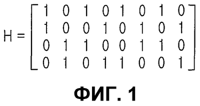 Фиг.1 является схемой, иллюстрирующей матрицу проверки на четность обычного кода НППЧ (8, 2, 4). На фиг.1 матрица Н проверки на четность кода НППЧ (8, 2, 4) состоит из 8 столбцов и 4 строк, причем весовое значение каждого столбца фиксируется на 2, а весовое значение каждой строки фиксируется на 4. Из-за того, что весовое значение каждого столбца и весовое значение каждой строки в матрице проверки на четность являются регулярными, как изложено выше, код НППЧ (8, 2, 4), показанный на фиг.1, становится регулярным кодом НППЧ.