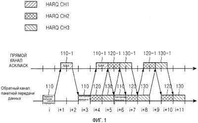 Повторная передача с использованием трех каналов HARQ в случае, представленном на фиг. 1, будет описана ниже. На фиг. 1 ссылочными позициями 110, 120 и 130 обозначены с первого по третий R-PDCH соответственно. Ссылочными позициями 110-1, 120-1 и 130-1 обозначены соответствующие каналы ответа для первого- третьего R-PDCH.