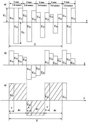 Задача предлагаемого изобретения заключается в увеличении уровней выходных демодулированных (восстановленных) канальных сигналов в многоканальных системах с временным уплотнением. Она достигается тем, что в качестве переносчика информации формируют импульсный сигнал сложной формы (ИССФ), представляющий собой сумму периодической последовательности прямоугольных импульсов с амплитудой U0 и периодом Т и n периодических с периодом Т сдвоенных прямоугольных импульсов с амплитудами Ui, расположенных симметрично относительно импульсов с амплитудами U0 со сдвигом во времени на величину i, при этом параметры немодулированных ИССФ, состоящих из 2n+1 не перекрывающихся во времени элементарных импульсов одинаковой длительности, определяют из решения системы уравнений , а элементарные импульсы импульсного сигнала сложной формы (ИССФ), используемого в качестве переносчика информации каждого канала, формируют в разных каналах, а после их разделения производят поочередное запоминание амплитуд соответствующих элементарных импульсов канальных ИССФ и запомненные сигналы подают на канальные ФНЧ.