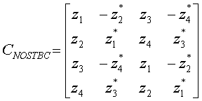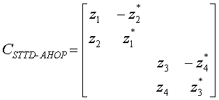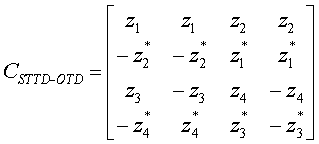 Следовательно, вышеприведенный код не ортогонален, так как корреляционные значения недиагональных элементов не исчезают. Соответственно, когда =1, =0, (в данном специальном случае, матрица кода передачи сводится к известной матрице STTD-OTD)