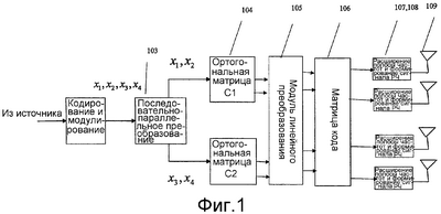 Модуль Пос/Пар 103 преобразует канально кодированные (ENC) (например, кодированные с использованием турбо- или сверточных кодов) и модулированные (МОД, MOD) потоки комплексных символов, по меньшей мере, в два параллельных потока комплексных символов, в которых, по меньшей мере, некоторые комплексные символы различаются между собой. В модулях 104 два потока символов раздельно кодируются для разнесения передачи с использованием матриц C1 и C2 ортогональных кодов (разнесения передачи), при этом каждая матрица имеет произвольный размер и скорость передачи. Символы в матрицах C1 и C2 кодов (разнесения передачи) или сами матрицы кодов (разнесения передачи) смешиваются с использованием линейного преобразования U в модуле 105 и, в результате, образуют преобразованные матрицы X1 и X2 кодов разнесения передачи. Преобразованные матрицы X1 и X2 кодов служат для формирования матрицы кода передачи в модуле C, т.е. модуле 106 формирования кода. Матрица кода передачи передается посредством, по меньшей мере, трех передающих антенн или лучей, или пучков 109 с использованием любого, по существу, ортогонального метода передачи сигнала, например, можно использовать разные ортогональные коды (например, коды Адамара) или разные временные интервалы, или разные компоненты Фурье (сигналы стандарта ортогонального уплотнения с разделением частот (OFDM) и/или поднесущие), или разные частотные полосы. Если дополнительно применяют параллельную передачу, чтобы повысить скорость передачи символов, то модуль Пос/Пар может выдавать больше двух символьных потоков 110, подлежащих, в конечном счете, комбинированию с другими параллельными потоками или матрицами кодов в модуле 106 формирования кода.