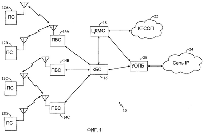 Если передача является традиционным телефонным вызовом, КБС 16 будет направлять принятые данные в ЦКМС 18, который обеспечивает дополнительные услуги маршрутизации для интерфейса с КТСОП 22. Если передача является передачей, основанной на пакетах, такой как вызов данных, предназначенный для сети 24 IP, ЦКМС 18 будет направлять пакеты данных в УОПД 20, который будет посылать пакеты в сеть 24 IP. Альтернативно КБС 16 будет направлять пакеты непосредственно в УОПД 20, который посылает пакеты в сеть 24 IP.