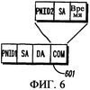 Фиг.6 иллюстрирует сообщение 601 “об обнаружении”, передаваемое узлами внутри системы 100 связи, желающими быть обнаруженными их соседним узлом. Как должно быть очевидно, в течение CTA узла он осуществляет широковещательную передачу стандартно отформатированного сообщения, как описано выше на фиг. 3, однако в поле PNID сообщения узел использует один из PNID соседних пикосетей. Кроме того, в течение участка “команды” сообщения (COM) узел осуществляет широковещательную передачу своего собственного PNID, DEVID (адрес источника (SA)) и другой необходимой информации синхронизации для работы его пикосети. На фиг. 6 видно, где узел, связанный с PNID1, осуществляет широковещательную передачу сообщения, адресованного PNID2 и адресу назначения (DA, который здесь должен быть адресом широковещательной передачи, например, 255, как определено в 802.15.3), с его полем “команды”, содержащим его собственный PNID (PNID1), и его собственную идентификацию устройства (DEVID) (которая является адресом источника (SA)).