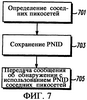 Фиг.7 представляет собой блок-схему, показывающую функционирование узла, желающего быть “обнаруженным” соседними узлами. Логический поток начинается на этапе 701, где узел сканирует свои окрестности, чтобы определить соседние пикосети и связанные PNID. На этапе 703 PNID сохраняются в базе 403 данных и используется в течение передач сообщений “об обнаружении”. В частности, на этапе 705 определяется PNID соседней пикосети из базы 403 данных, и сообщение “об обнаружении” посылается ко всем соседним узлам. Как обсуждалось выше, сообщение об обнаружении содержит PNID соседней пикосети, PNID узла и уникальную идентификацию устройства (SA) узла. Дополнительно сообщение об обнаружении может быть подтверждено пакетом данных от узла, принимающего сообщение об обнаружении, чтобы узел, передающий сообщение об обнаружении, мог определять все другие узлы, которые слышат сообщение об обнаружении. Следует отметить, что даже при том, что узел осуществляет широковещательную передачу сообщения об обнаружении, узел продолжает отслеживать сообщения об обнаружении, передаваемые другими узлами в других пикосетях; и реагирует на любое принятое сообщение об обнаружении подтверждением приема.
